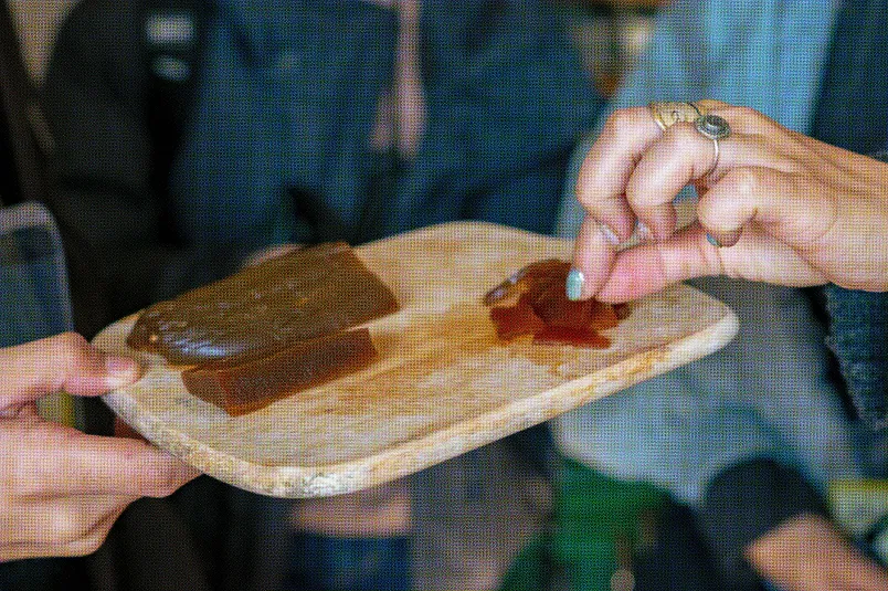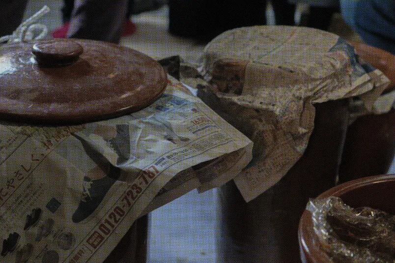 大豆をすりつぶす手動の機械など、見慣れない道具が並ぶ台所の奥に進むと現れる広大な土間の一角には、たくさんの壺が。法子さんが「(微生物が)一番好きな場所」と語るこの一角には、地域の人々も自ら仕込んだ食べ物を持ってきては、お世話をしに戻ってくるといいます。中にはすでに亡くなったおかんが仕込み、すくらむのおかんが毎年掘り起こしては漬け直し、手入れしてきた10年ものの真っ黒な木之本漬けもあります。言葉にならない味や手間が世代を超えて壺ごと受け継がれ、じわじわと発酵し続けているのです。