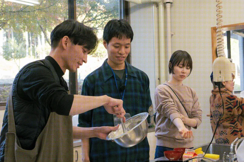 1日の後半を過ごした赤谷荘もまた、そうした場の一つです。元々1980 年、農村女性の地位の向上や、栄養状態の改善を目指す活動の拠点として開設された施設でしたが、家庭や地域の行事で共有されてきた郷土料理を学び、開発するまた別の場として親しまれてきました。2023年に一度は長浜市から民間企業の手に渡りましたが、管理運営が難しく、2024年には惜しまれつつ閉館。湖北地域や琵琶湖の味をつないできた大切な場を残すべく、2025年夏に堀江さんやTsunaguの皆さんで引き取り、運用を再開したばかりの時にお邪魔させていただいたのでした。
